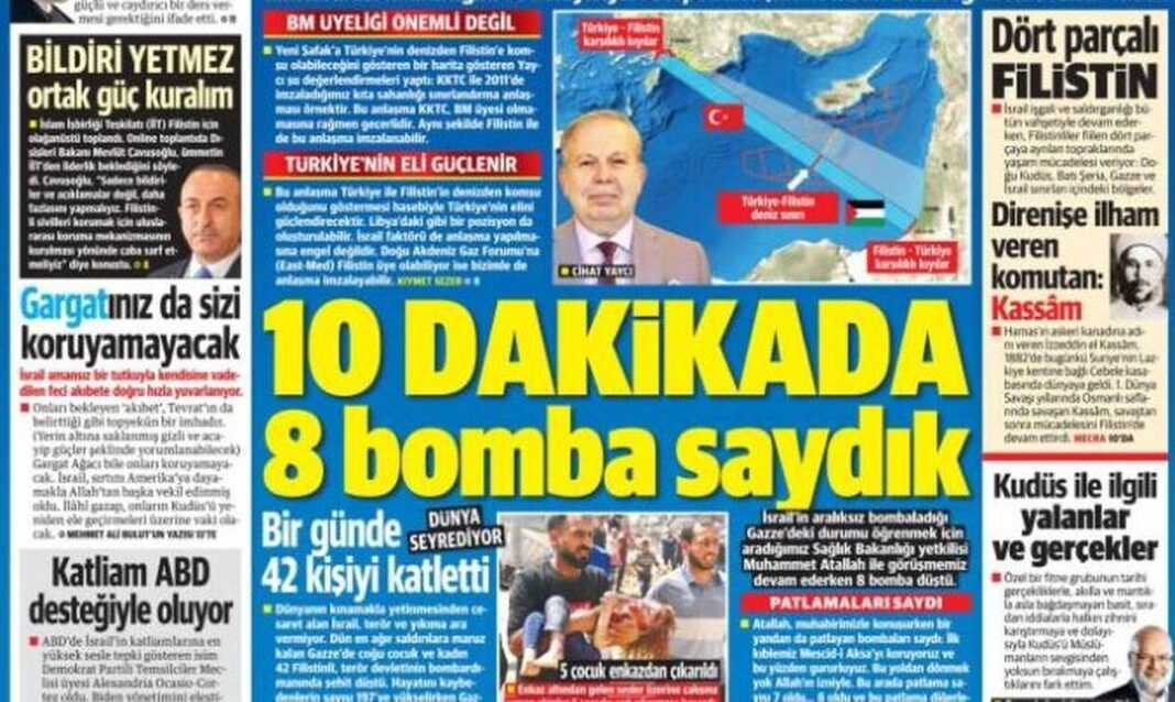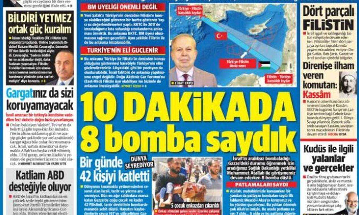 Στον μεν λόγω χάρτη παρουσιάζεται η Ανατολική Μεσόγειος και η σύνδεση της Τουρκίας με την Παλαιστίνη, με ένα μνημόνιο αντίστοιχο με αυτό που είχε υπογραφεί ανάμεσα σε Τουρκία και Λιβύη. Μάλιστα ο απόστρατος ναύαρχος Γιαϊτζί προτείνει άμεση υπογραφή συμφωνίας με την Παλαιστίνη. Η εφημερίδα μάλιστα σχολιάζει χαρακτηριστικά ότι η υπογραφή μιας τέτοιας συμφωνίας για την ΑΟΖ μπορεί να αλλάξει τις ισορροπίες στην περιοχή.