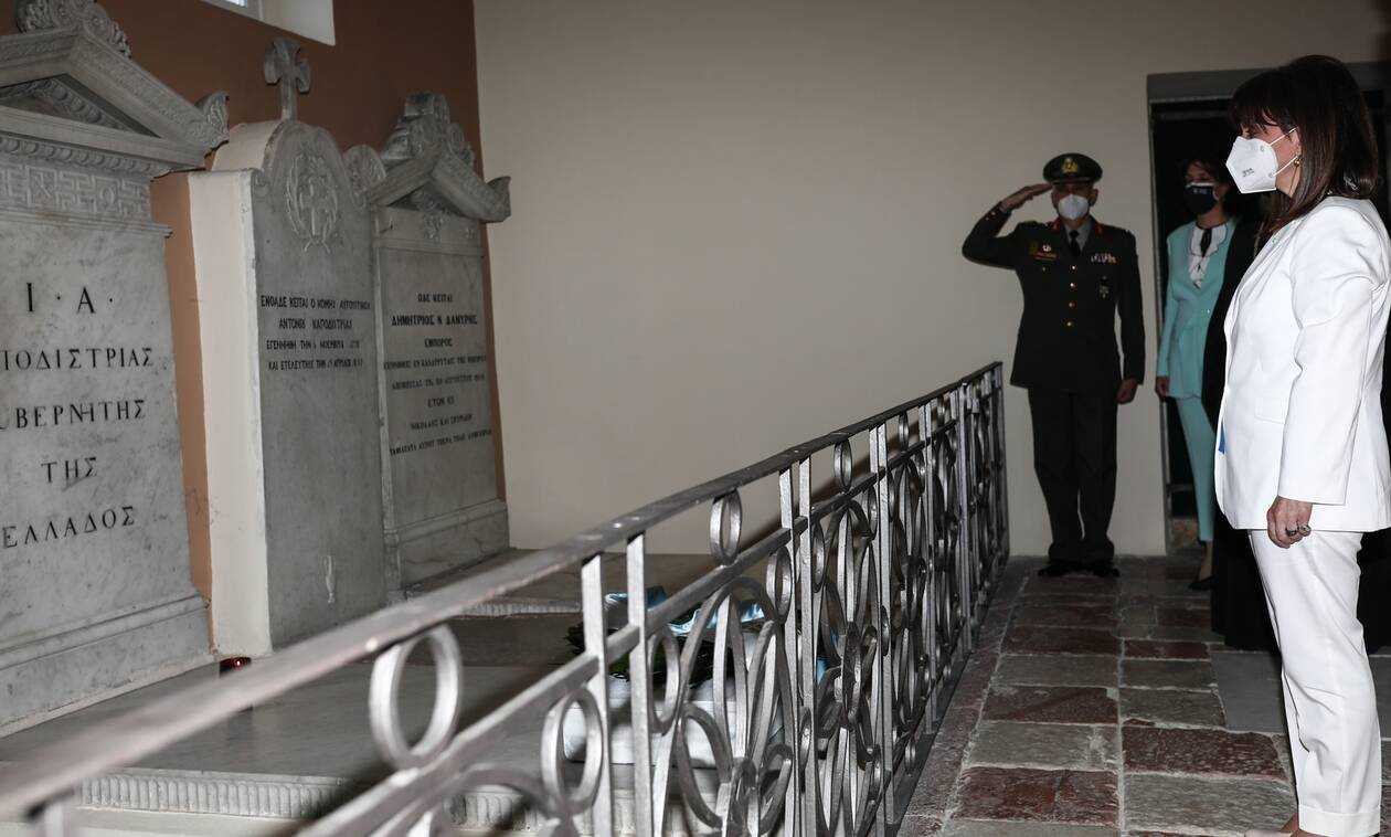 Στεφάνι στον τάφο του Ιωάννη Καποδίστρια, που βρίσκεται στην Ιερά Μονή Πλατυτέρας, κατέθεσε η Πρόεδρος της Δημοκρατίας Κατερίνα Σακελλαροπούλου, που παρέστη στην επιμνημόσυνη δέηση, προεξάρχοντος του Μητροπολίτη Κέρκυρας, Παξών και Διαποντίων Νήσων κ. Νεκταρίου.