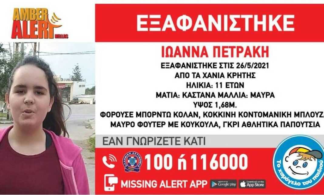 Συναγερμός σήμανε στα Χανιά την Τετάρτη 26 Μαίου από την εξαφάνιση της 11χρονης Ιωάννας.