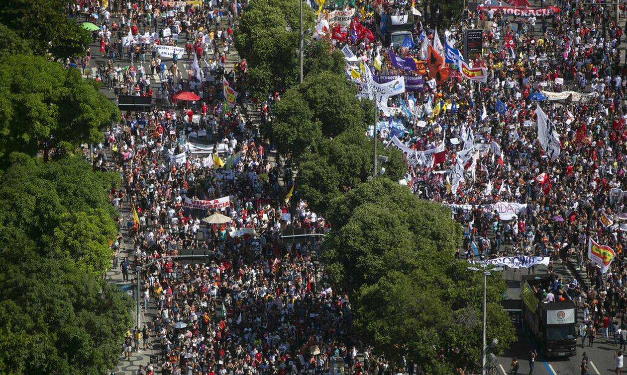 Στο κέντρο του Ρίο, δέκα χιλιάδες άνθρωποι διαδήλωσαν φορώντας μάσκες έπειτα από πρόσκληση αριστερών και φοιτητικών οργανώσεων φωνάζοντας «Μπολσονάρο Έξω!» και «Μπολσονάρο Γενοκτονία!».