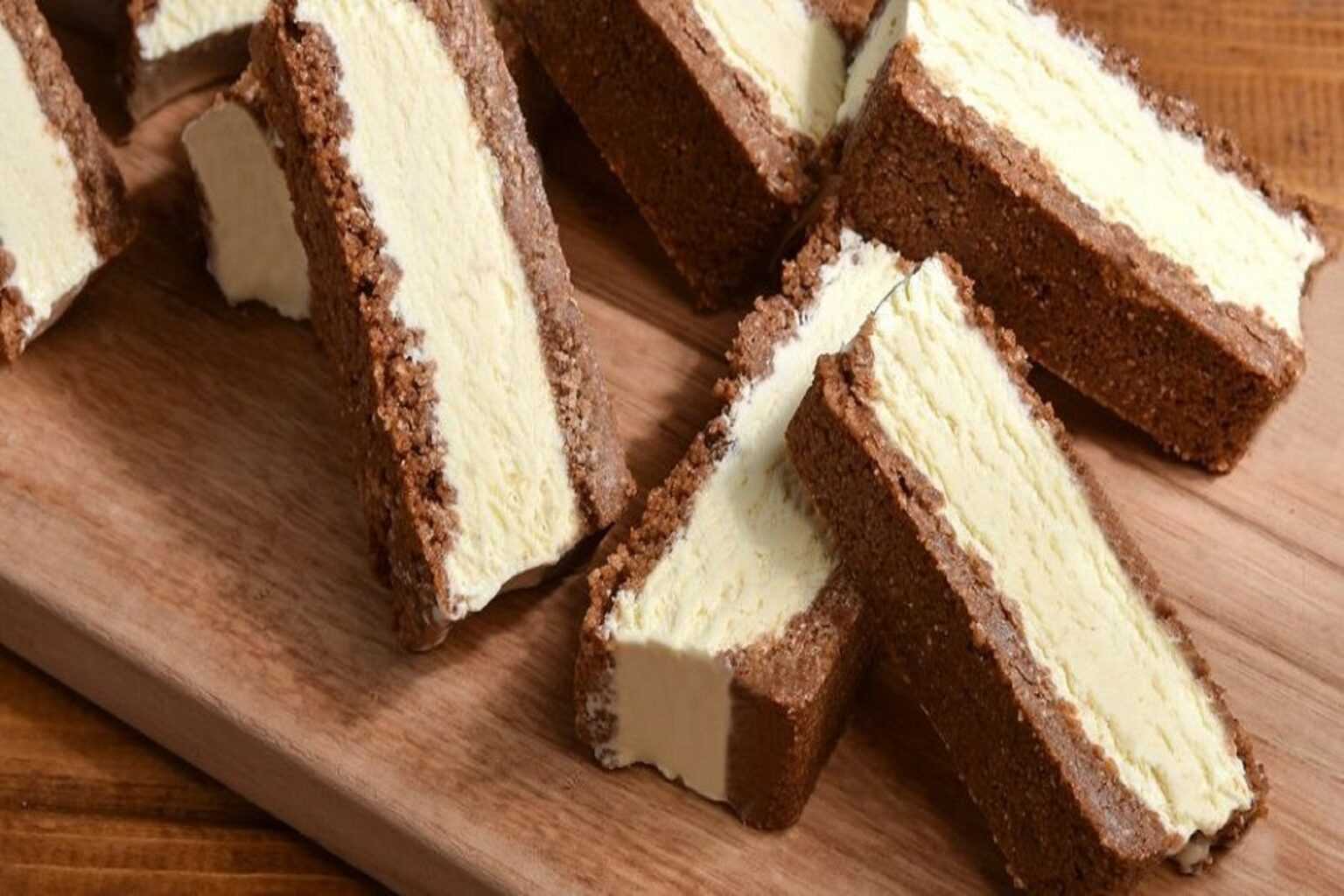 Μεταφέρετε τη ζύμη των μπισκότων σε ένα ταψάκι με ένα αντικολλητικό χαρτί ψησίματος και χρησιμοποιήστε τα χέρια σας (βρεγμένα, για να μην κολλήσουν), για να φτιάξετε τη ζύμη σε σχήμα ορθογώνιου παραλληλόγραμμου. Τοποθετήστε τη ζύμη στην κατάψυξη για περίπου 20 λεπτά, ύστερα χρησιμοποιήστε ένα μεγάλο μαχαίρι για να κόψετε τη ζύμη σε 8 ορθογώνια μπισκότα. Ξαναβάλτε τα στην κατάψυξη, όσο φτιάχνετε το παγωτό.