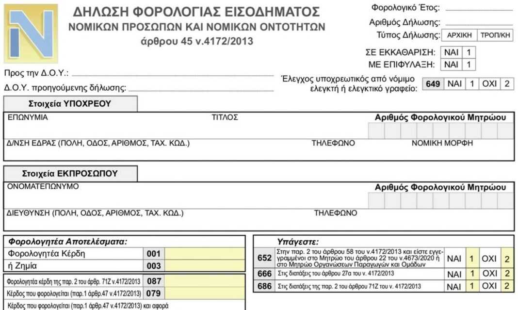 Δημοσιεύτηκε στην Εφημερίδα της Κυβερνήσεως ο τύπος και το περιεχόμενο των δηλώσεων φορολογίας εισοδήματος φορολογικού έτους 2020 των νομικών προσώπων, το γνωστό έντυπο Ν.