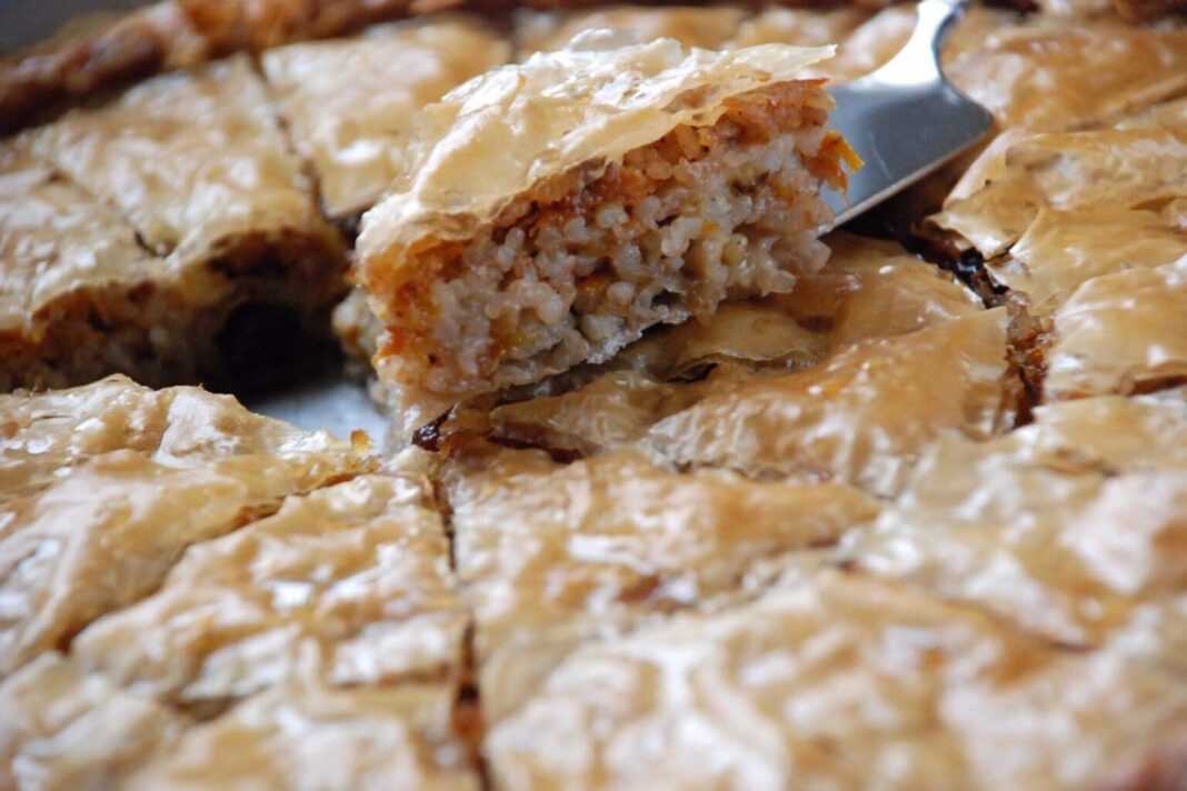 Λαδώνουμε το ταψί. Χωρίζουμε τη ζύμη σε δύο μέρη. Ανοίγουμε το μισό ζυμάρι σε φύλλο λίγο μεγαλύτερο από το ταψί και το τοποθετούμε στο ταψί. Στρώνουμε τη γέμιση. Ανοίγουμε φύλλο με το δεύτερο ζυμάρι, ίδιο μέγεθος με το ταψί και σκεπάζουμε την πίτα. Κλείνουμε την πίτα γύρω – γύρω και τη χαράζουμε σε κομμάτια. Το μαχαίρι να μην κόψει μέχρι κάτω την πίτα, μόνο την επιφάνεια και αυτή όχι παντού. Αλλού να είναι κομμένη έτσι ώστε να εισχωρήσει ο χυλός στο ρύζι και αλλού να υπάρχουν κάποια σημεία σύνδεσης, οπότε όταν ρίξουμε τον χυλό να μην φύγουν τα κομμένα κομμάτια από το ζυμάρι και να χαλάσει η επιφάνεια.