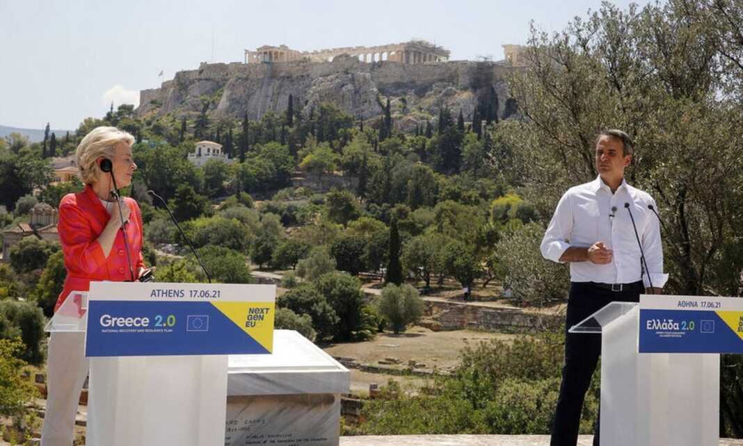 Στην Ελλάδα, την ανάκαμψη μετά την πανδημία και τις επενδύσεις που φέρνει το σχέδιο Ελλάδα 2.0 αναφέρθηκαν Κυριάκος Μητσοτάκης και Ούρσουλα φον ντερ Λάιεν στην συμβολική εκδήλωση που διοργανώθηκε το πρωί της Πέμπτης στην Αρχαία Αγορά.
