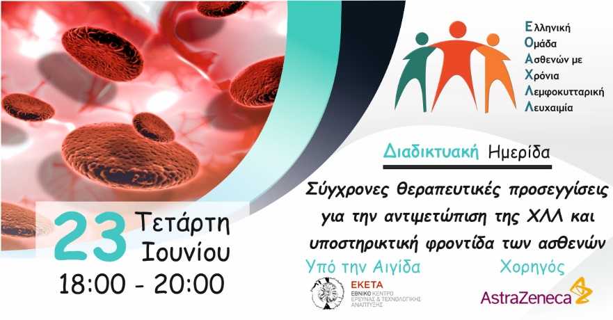 Η Ελληνική Ομάδα Ασθενών με Χρόνια Λεμφοκυτταρική Λευχαιμία (ΕΟΑΧΛΛ) σας προσκαλεί να παρακολουθήσετε, μέσω της πλατφόρμας ZOOM, την διαδικτυακή ημερίδα που διοργανώνει ο σύλλογος για τις σύγχρονες μεθόδους φαρμακευτικής αντιμετώπισης και ψυχολογικής υποστήριξης των ασθενών με ΧΛΛ (Χρόνια Λεμφοκυτταρική Λευχαιμία), στα πλαίσια της εκστρατείας ενημέρωσης του κοινού για τη Χρόνια Λεμφοκυτταρική Λευχαιμία. Η ημερίδα θα διεξαχθεί την Τετάρτη, 23/06, στις 18:00.