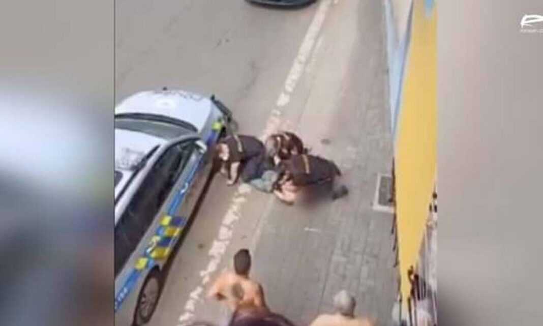 Ο άνδρας φαίνεται να παλεύει με τρεις αστυνομικούς και λεπτά αργότερα βρίσκεται ακίνητος στο έδαφος.