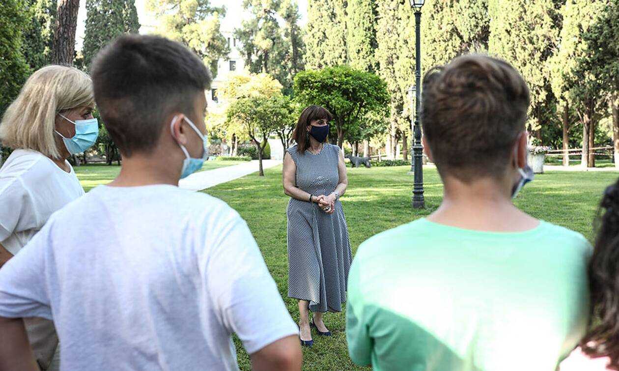 Η κυρία Σακελλαροπούλου συζήτησε με τα παιδιά (ηλικίας 6 με 16 χρόνων) για τα καλοκαιρινά τους σχέδια. Εκείνα ξεναγήθηκαν και έπαιξαν στον κήπο, ζωγράφισαν τα αγάλματα αλλά και το Προεδρικό Μέγαρο και δώρισαν στην Πρόεδρο κάποιες από τις ζωγραφιές τους.