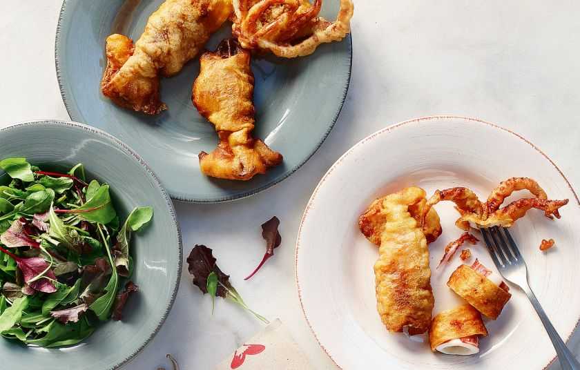 Ανακατεύουμε το αλεύρι με το κορν φλάουρ και το αλάτι και ρίχνουμε σταδιακά την μπίρα, ανακατεύοντας με το σύρμα, μέχρι να έχουμε ένα ομοιογενές κουρκούτι. Σε ένα βαθύ τηγάνι ρίχνουμε ελαιόλαδο μέχρι να καλύψει τα 2/3 του σκεύους και το ζεσταίνουμε σε μέτρια φωτιά. Βουτάμε τα θράψαλα στο κουρκούτι, τινάζουμε ελαφρώς και τα ρίχνουμε στο καυτό λάδι. Τηγανίζουμε σε δόσεις για 2-3 λεπτά, γυρίζοντάς τα τακτικά, μέχρι να πάρουν χρυσαφένιο χρώμα. Τα στραγγίζουμε σε χαρτί κουζίνας και σερβίρουμε με πατάτες τηγανητές.