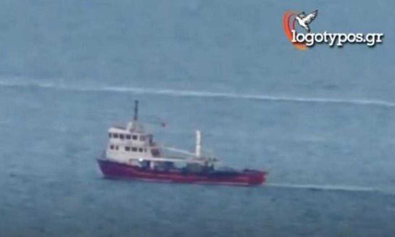 Στο βίντεο που εξασφάλισε η ιστοσελίδα Logos Typos φαίνεται ένα από τα αλιευτικά να κινείται με χαμηλή ταχύτητα, σέρνοντας μάλιστα πίσω του και ιχθυοκλωβό.