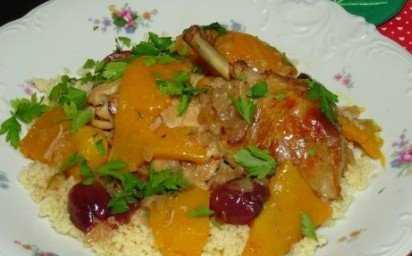 Μοιράζουμε το κους κους στα πιάτα και από πάνω τοποθετούμε το κοτόπουλο με τα συνοδευτικά του. Κόβουμε μερικά φύλλα μαϊντανού από πάνω.