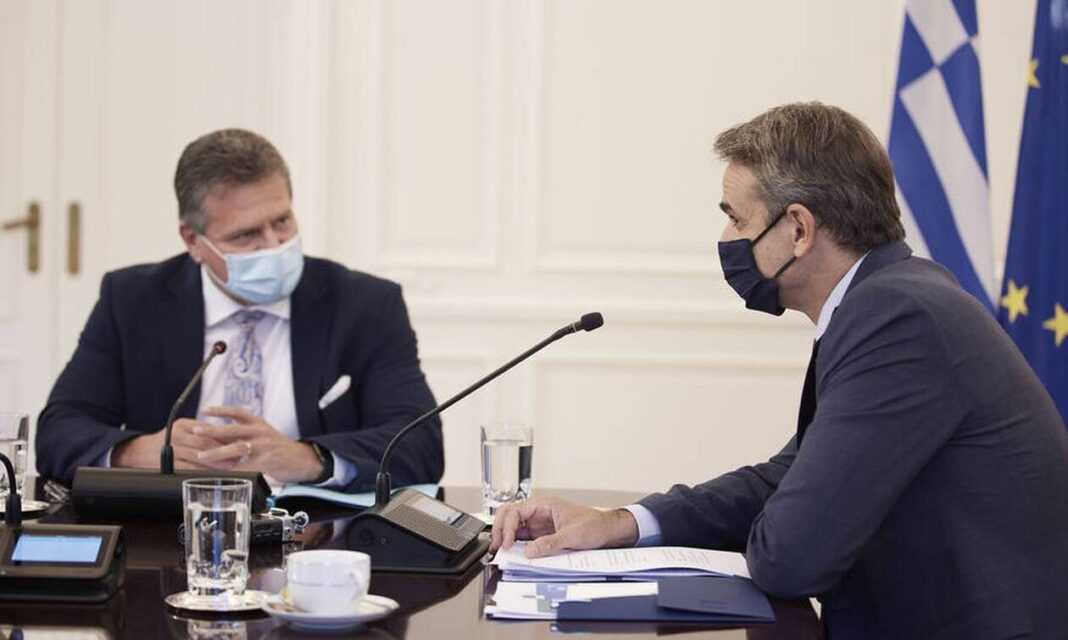 Στην έναρξη της συνάντησης, έγινε ο εξής διάλογος ανάμεσα στον πρωθυπουργό Κυριάκο Μητσοτάκη και τον αντιπρόεδρο της Ευρωπαϊκής Επιτροπής, Μάρος Σέφκοβιτς: