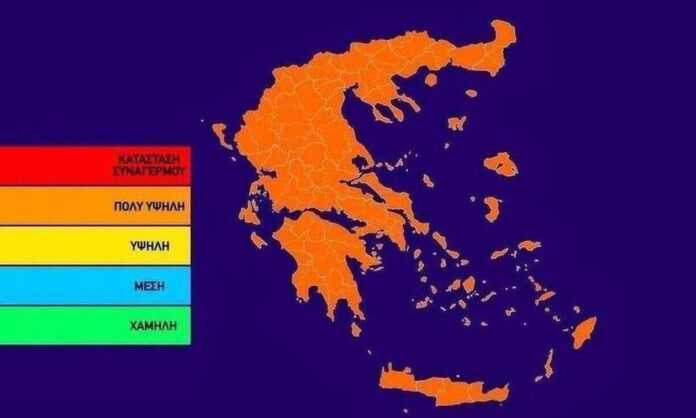 Σύμφωνα με το Χάρτη Πρόβλεψης Κινδύνου Πυρκαγιάς που εκδίδει η Γενική Γραμματεία Πολιτικής Προστασίας του Υπουργείου Προστασίας του Πολίτη (www.civilprotection.gr), για αύριο Τετάρτη 21 Ιουλίου 2021, προβλέπεται πολύ υψηλός κίνδυνος πυρκαγιάς (κατηγορία κινδύνου 4) για τις εξής περιοχές: