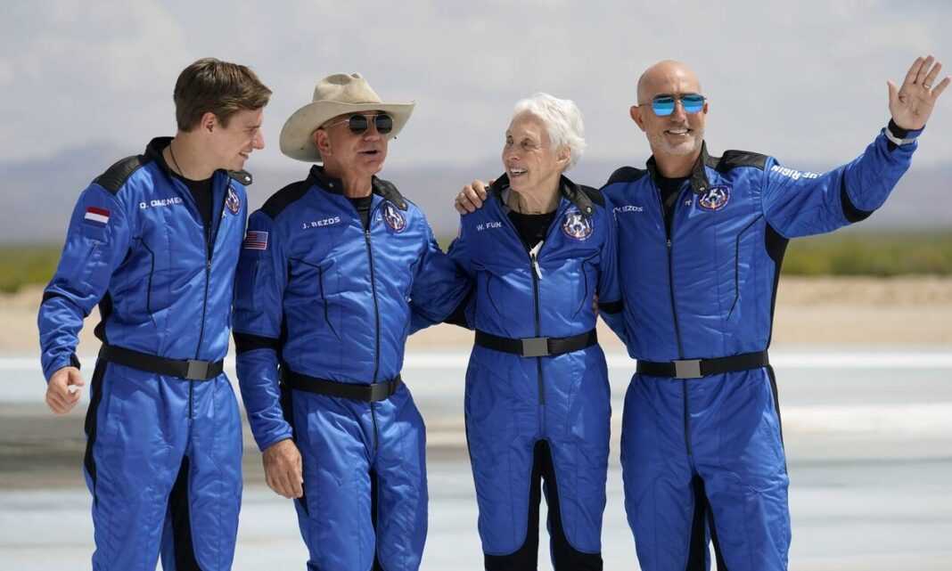 Η εκτόξευση έγινε από το Τέξας, ενώ τον Τζεφ Μπέζος συνόδευσε στο διαστημικό ταξίδι ο αδερφός του Μαρκ, η 82χρονη πιλότος Γουάλι Φρανκ και ο 18χρονος Όλιβερ, περνώντας για λίγα λεπτά έξω από την ατμόσφαιρα της Γης, στην πρώτη πτήση της Blue Origin.