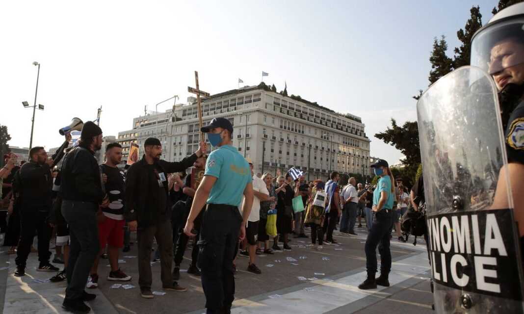 Ένταση στο κέντρο της Αθήνας με ομάδες αντιεξουσιαστών και διαδηλωτών κατά των εμβολιασμών να έχουν λογομαχίες και συγκρούσεις που κατέληξαν στον τραυματισμό ενός από τους πρώτους.