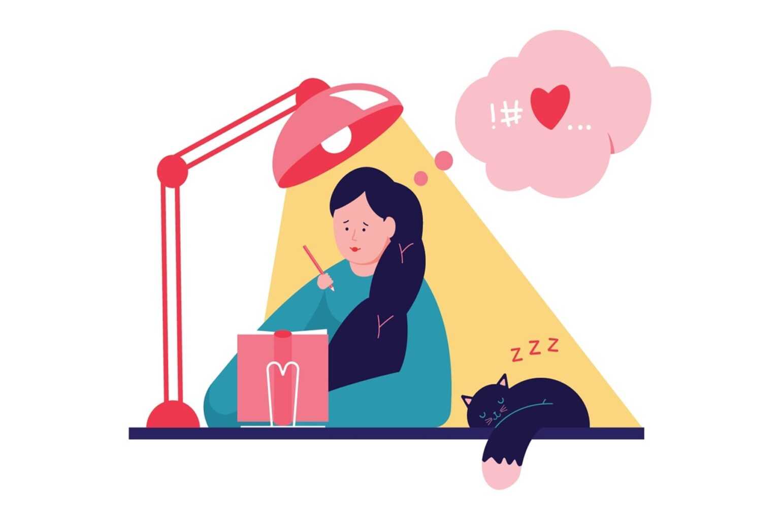 Journaling vector illustration. Writing daily diary flat tiny persons concept. Self expression in text note as psychological trauma therapy or treatment. Style of communication as stress reliever.