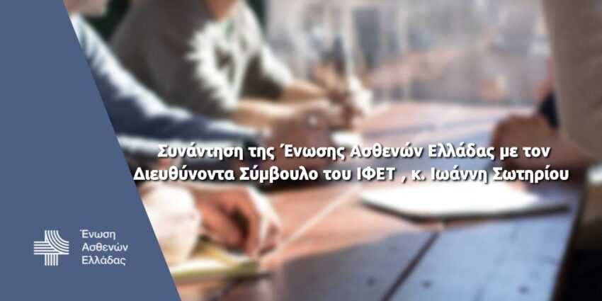 Η Ένωση Ασθενών Ελλάδας πραγματοποίησε συνάντηση εργασίας με τον Διευθύνοντα Σύμβουλο του Ινστιτούτου Φαρμακευτικής Έρευνας και Τεχνολογίας, κ. Ιωάννη Σωτηρίου, την Τρίτη 27 Ιουλίου 2021.