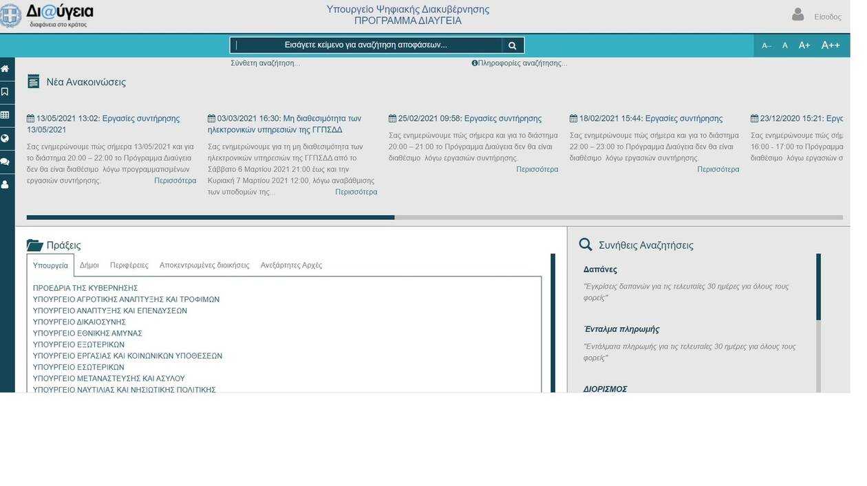 Λόγω του τεχνικού προβλήματος δεν είναι δυνατή η ανάρτηση νέων πράξεων, καθώς και η εμφάνιση εγγράφων ήδη αναρτημένων πράξεων στο πρόγραμμα Διαύγεια.