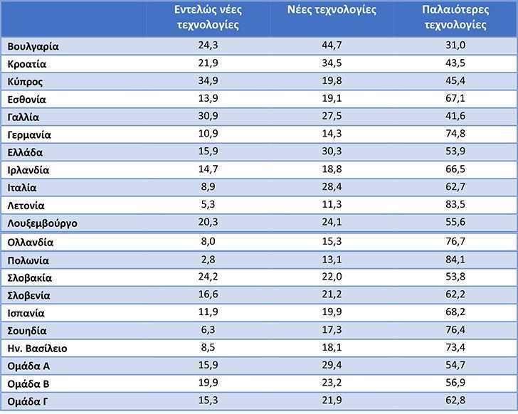 Περιορισμένη, αλλά σε καμία περίπτωση αμελητέα, χρήση των νέων και των εντελώς νέων τεχνολογιών κάνουν οι επιχειρήσεις αρχικών σταδίων στην Ελλάδα. Το 2017, το 15,9% των επιχειρηματιών αρχικών σταδίων στη χώρα μας (έναντι 19,5% το 2016) δήλωνε ότι χρησιμοποιεί εντελώς νέες τεχνολογίες κατά την παραγωγική διαδικασία ή κατά την παροχή υπηρεσιών. Το ίδιο έτος, το ποσοστό των εταιρειών αρχικών σταδίων, που δήλωνε ότι κάνει χρήση νέων τεχνολογιών ανερχόταν σε 30%. Μάλιστα, για το 2017 η χώρα μας ταξινομείται μεταξύ των χωρών με τα υψηλότερα ποσοστά νέων επιχειρηματικών εγχειρημάτων, που στηρίζονται σε εντελώς νέες ή απλά έστω νέες τεχνολογίες. Στο μεταξύ, το ποσοστό των επιχειρηματιών αρχικών σταδίων στη χώρα, που αξιοποιεί γνωστές τεχνολογίες, εξασθένησε ελαφρά το 2017 σε 53,9% από 56,1,% το 2016. Καθώς ο τεχνολογικός εκσυγχρονισμός των νέων εγχειρημάτων αποτελεί τη βάση για μια βιώσιμη και με προοπτικές ανάπτυξης επιχειρηματικότητα, το αποτέλεσμα αυτό δεν είναι ικανοποιητικό. Ωστόσο, το γεγονός ότι παραμένει υψηλό το ποσοστό των γνωστών τεχνολογιών μπορεί να συνδεθεί με παράγοντες που έχουν να κάνουν με την κρίση, καθώς κατά κανόνα οι εντελώς νέες τεχνολογίες είναι και ακριβότερες.