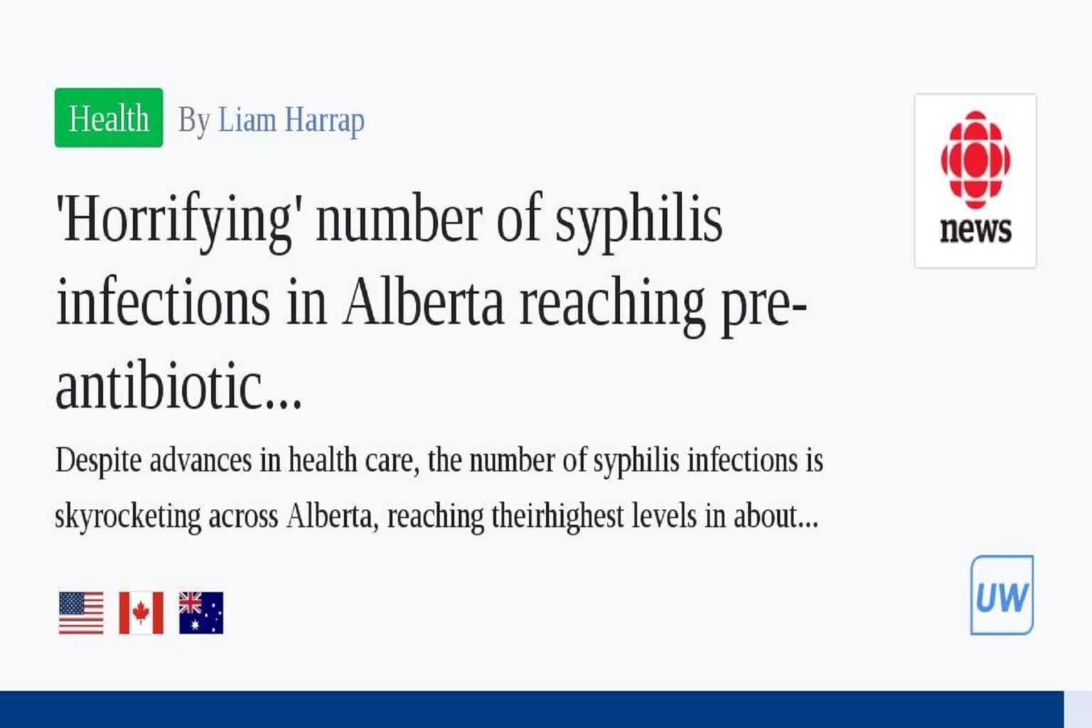 Καναδάς Αλμπέρτα: Οι λοιμώξεις από σύφιλη στην Αλμπέρτα φτάνουν σε επίπεδα προ αντιβιοτικών Τα τελευταία χρόνια, τα κρούσματα σύφιλης στην Αλμπέρτα αυξάνονται σταθερά. Το 2014, αναφέρθηκαν 161 περιπτώσεις της σεξουαλικώς μεταδιδόμενης νόσου (ΣΜΝ), ενώ το 2020, 2.509, σύμφωνα με κυβερνητικά στοιχεία. Το CBC News αναφέρει ότι υπήρχαν 765 κρούσματα ΣΜΝ στην επαρχία μόνο κατά τους πρώτους τρεις μήνες του 2021, αριθμός που εκτοξεύτηκε στα ύψη που δεν παρατηρήθηκε τα τελευταία 70 χρόνια. ”