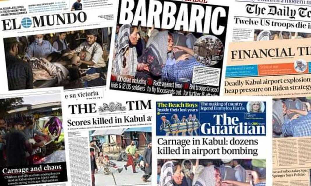 H διπλή φονική επίθεση στην Καμπουλ όπως είναι αναμενόμενο φιλοξενείται στα περισσότερα πρωτοσέλιδα των εφημερίδων σε όλο τον κόσμο που αναφέρονται στο μακελειό από το χτύπημα του Ισλαμικού Κράτους του Χορασάν με άλλες εφημερίδες να αναφέρονται απλά στο γεγονός, άλλες να χρησιμοποιούν λέξεις όπως «βαρβαρότητα» και άλλες να επιρρίπτουν στον Τζο Μπάιντεν την ευθύνη για την εξέλιξη αυτή.