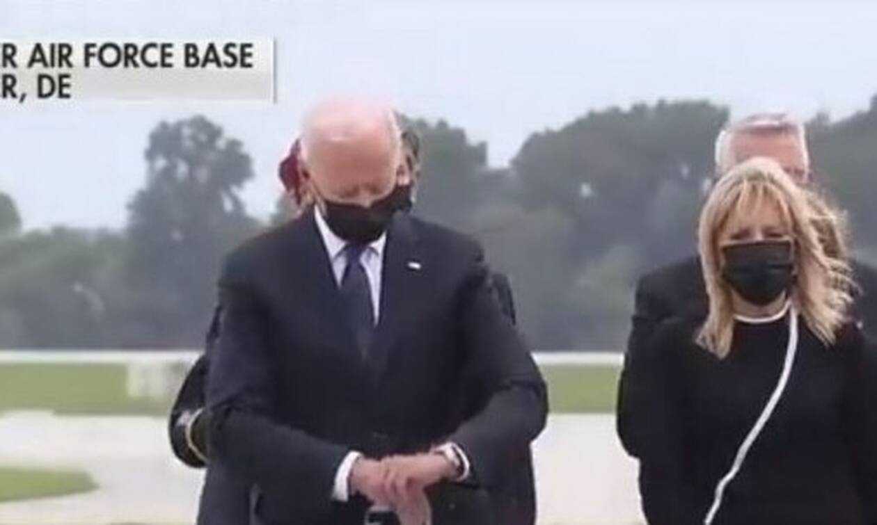 Ωστόσο, όπως αναφέρει το δημοσίευμα, μερικές στιγμές μετά τον στρατιωτικό χαιρετισμό προς τιμήν των 13 στρατιωτών, ο Αμερικανός πρόεδρος καταγράφηκε σε βίντεο να κοιτάζει το ρολόι του.