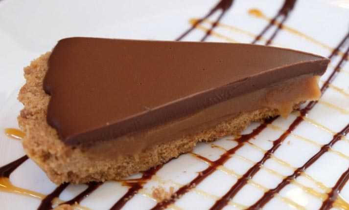 Ζεσταίνετε την κρέμα γάλακτος, αποσύρετε απ’ τη φωτιά και προσθέτετε την κουβερτούρα σε κομματάκια. Ανακατεύετε μέχρι να λιώσει η σοκολάτα και να ομοιογενοποιηθεί το μείγμα. Περιχύνετε την τάρτα με τη σοκολάτα πάνω από τη στρώση καραμέλας και ξαναβάζετε στο ψυγείο μέχρι να σφίξει κι αυτή. Αφήνετε το γλυκό λίγη ώρα εκτός ψυγείου πριν σερβίρετε.