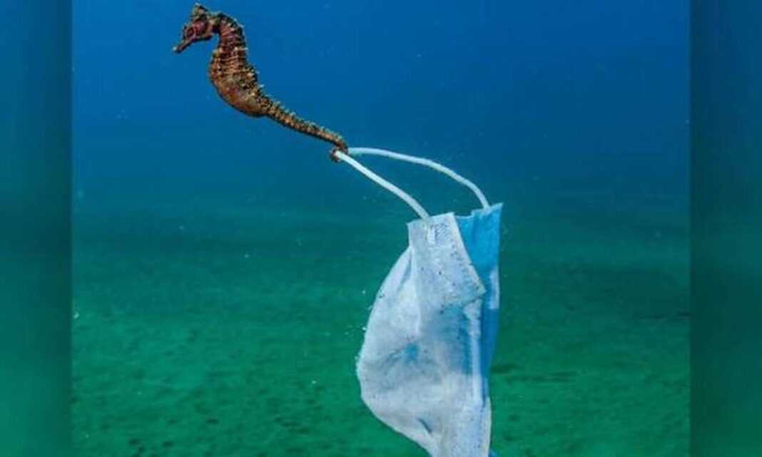 Η εξαιρετική φωτογραφία του Έλληνα φωτογράφου, Νικόλα Σαμαρά τραβήχτηκε στο Στρατώνι της Χαλκιδικής και απεικονίζει έναν ιππόκαμπο, στην ουρά του οποίου έχει πιαστεί μια μάσκα προστασίας από την Covid-19, που πέταξε κάποιος ασυνείδητος ή παρασύρθηκε από τον άνεμο στη θάλασσα.