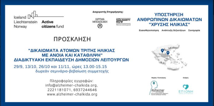 Υλοποιώντας το έργο προάσπισης των δικαιωμάτων ατόμων με άνοια και κατάθλιψη στην τρίτη ηλικία, η συγκεκριμένη δράση συμβάλλει στην ευαισθητοποίηση-εκπαίδευση-υποστήριξη των δημοσίων λειτουργών της Στερεάς Ελλάδας, στις σχέσεις τους με τους πολίτες, που αναφέρονται: στην ειδική μέριμνα για τα άτομα τρίτης ηλικίας με άνοια και κατάθλιψη, τη διακριτική και με ευαισθησία μεταχείριση των σχετικών θεμάτων και τη διευκόλυνση της επικοινωνίας με τα ευάλωτα άτομα και τις οικογένειές τους. Η εκπαίδευση θα πραγματοποιηθεί διαδικτυακά, από την ομάδα του έργου και κοινωνικούς επιστήμονες και νομικούς που συμμετέχουν εθελοντικά στο έργο. Η μεθοδολογία είναι συμμετοχική, με έμφαση στο μοίρασμα των εμπειριών των συμμετεχόντων που επιθυμούν να πάρουν το λόγο.