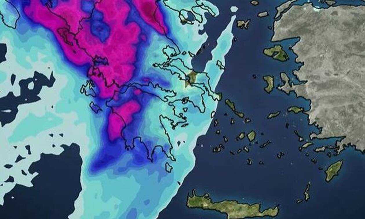 Η διαδικασία που περιγράψαμε παραπάνω θα προκαλέσει ισχυρή κακοκαιρία και με διάρκεια σε πολλές περιοχές της χώρας μας. Στον τρίτο μας χάρτη με τους χρωματισμούς μπορούμε να δούμε που αναμένονται μεγάλα ύψη βροχής (είτε με την μορφή έντονων βροχοπτώσεων, καταιγίδων ή και μέτριας έντασης βροχοπτώσεων μεγάλης όμως διάρκειας).