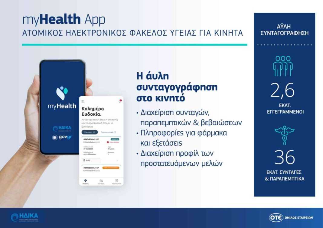 Να θυμίσουμε ότι το έργο ξεκίνησε το 2012, όταν ο Όμιλος ΟΤΕ ανέλαβε να υλοποιήσει αρχικά την πρώτη φάση του. Αφορούσε τη διασύνδεση ιατρών και Φορέων Κοινωνικής Ασφάλισης για την ηλεκτρονική καταχώρηση και εκτέλεση συνταγών φαρμάκων. Το επόμενο βήμα έγινε στα τέλη Μαρτίου του 2020, στην αρχή της πανδημίας, με τη μετάβαση στην άυλη συνταγογράφηση. Η εφαρμογή myHealth αποτελεί το τρίτο μεγάλο βήμα στο έργο της άυλης συνταγογράφησης και σύντομα θα εμπλουτιστεί με νέα στοιχεία. Ένα πολυδιάστατο έργο-ορόσημο για την ψηφιακή μεταρρύθμιση της Υγείας στη χώρα μας, που αξίζει να είναι κάποιος περήφανος. Όπως είπε ο Γρηγόρης Χριστόπουλος, Commercial Officer Business Segment Ομίλου ΟΤΕ: «Είμαστε υπερήφανοι που συμβάλλαμε καθοριστικά σε αυτό το έργο που άλλαξε την καθημερινότητα όλων μας, και μας έκανε να νιώσουμε ασφαλείς και στις πιο δύσκολες συνθήκες. Είναι ένα πολυσύνθετο έργο, που χάρη σε όλους τους ανθρώπους που δούλεψαν γι’ αυτό, υλοποιήθηκε άρτια και σε χρόνους-ρεκόρ».
