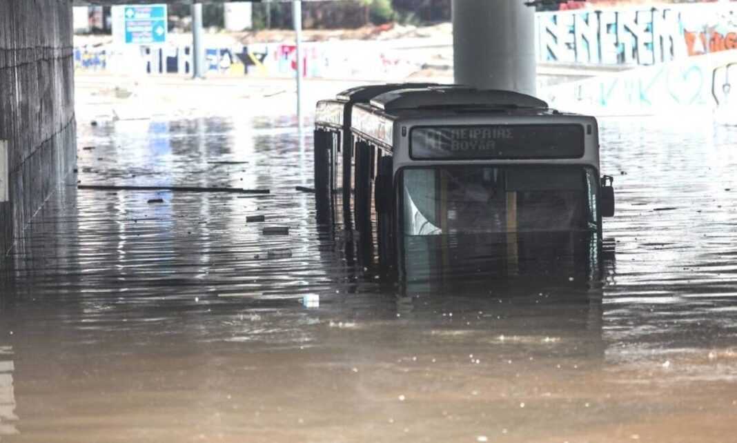 Ενδεικτική είναι η εικόνα που κυκλοφορεί τις τελευταίες ώρες στο Twitter και έχει γίνει viral, με ένα λεωφορείο να είναι σχεδόν εξ ολοκλήρου εξαφανισμένο μέσα στο νερό…