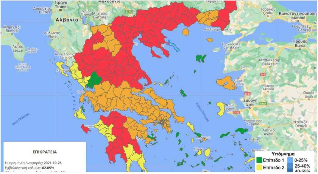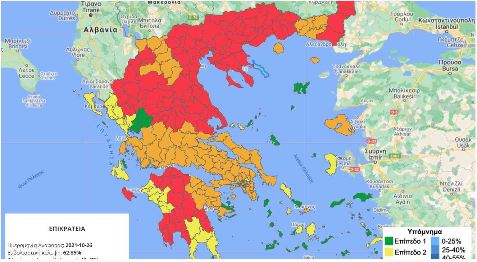 Αυτή την εβδομάδα αναμένεται να εμφανιστούν και περιοχές σε “βαθύ κόκκινο” που εντάσσονται στο επίπεδο 5 του επιδημιολογικού κινδύνου. Στο βαθύ κόκκινο (επίπεδο 5) βρίσκονται αυτή τη στιγμή, οι εξής περιοχές: Θεσσαλονίκη, Αρκαδία, Αγιο Ορος, Αχαΐα, Λάρισα, Μαγνησία, Κιλκίς, Ημαθία, Πιερία, Έβρος, Πέλλα, Ξάνθη, Δράμα, Μεσσηνία, Σέρρες, Τρίκαλα, Καβάλα,