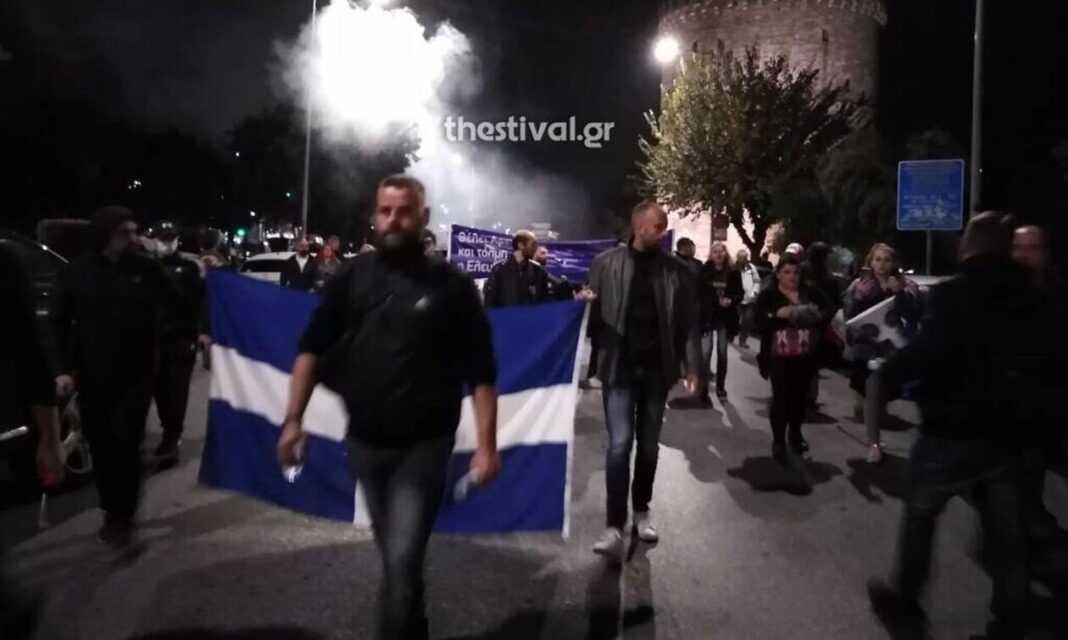 Συγκέντρωση στον Λευκό Πύργο πραγματοποίησαν ομάδες ατόμων που αντιδρούν στην υποχρεωτικότητα των εμβολίων κατά της Covid-19.