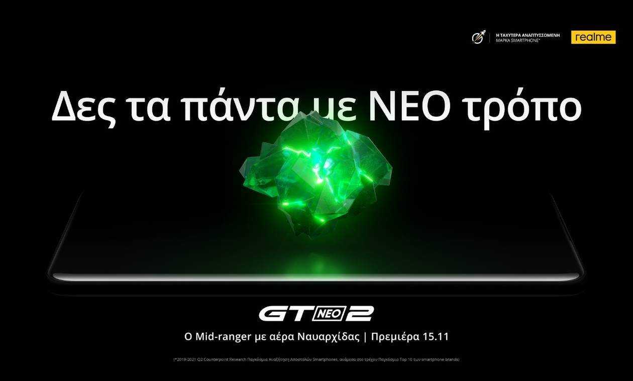 Η realme, η ταχύτερα αναπτυσσόμενη εταιρεία smartphone παγκοσμίως και μια από τις έξι κορυφαίες εταιρείες smartphone στον κόσμο, φέρνει στην Ελλάδα το realme GT NEO 2, στις 15 Νοεμβρίου