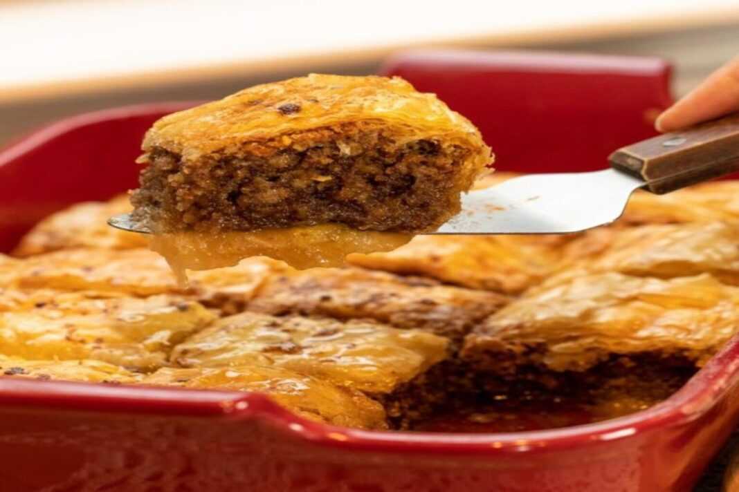 - Βγάζουμε από το φούρνο και περιχύνουμε με το σιρόπι με μια κουτάλα όλο το γλυκό. Όταν γίνει το σιρόπι, ολοκληρώστε το κόψιμο των κομματιών κόβοντας κάθε κομμάτι μέχρι τον πάτο. Αφήστε το να κρυώσει και διατηρήστε το ακάλυπτο σε δροσερό, ξηρό μέρος.