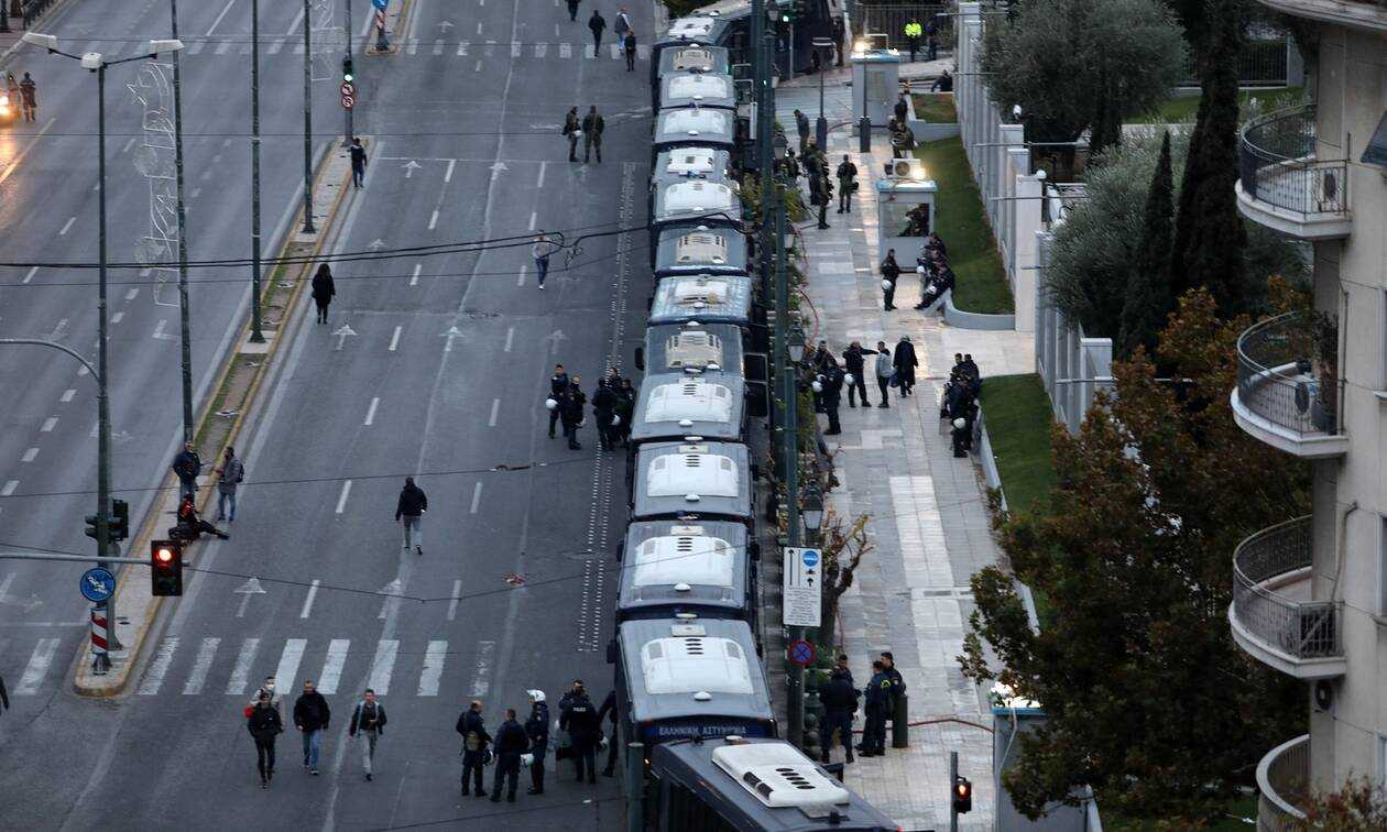 Οι αστυνομικές δυνάμεις έλαβαν τα αυστηρότερα μέτρα των τελευταίων πολλών ετών στο κέντρο της Αθήνας. Το Πολυτεχνείο τέθηκε μέσα σε λίγα λεπτά σε αστυνομικό κλοιό, αμέσως μόλις ξεκίνησε η πορεία με την αιματοβαμμένη ελληνική σημαία στην κορυφή. Δυνάμεις των ΜΑΤ και της ΥΜΕΤ περικύκλωσαν το Πολυτεχνείο και ουσιαστικά το «σφράγισαν». Προληπτικά τοποθετήθηκε ακόμα και ο «Αίαντας» (υδροφόρο όχημα της ΕΛ.ΑΣ.) επί της οδού Στουρνάρη, ενώ διμοιρίες των ΜΑΤ περικύκλωσαν την πλατεία Εξαρχείων.
