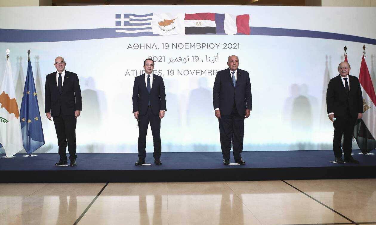 1. Σε συνέχεια της πρώτης μας συνάντησης, που πραγματοποιήθηκε τον Ιανουάριο του 2020 στο Κάιρο, και των αποτελεσμάτων και του τελικού ανακοινωθέντος, εμείς, οι υπουργοί Εξωτερικών της Ελλάδας, της Κύπρου, της Αιγύπτου και της Γαλλίας συναντηθήκαμε στην Αθήνα στις 19 Νοεμβρίου 2021, για να συζητήσουμε τις πρόσφατες εξελίξεις στην περιοχή, υπό το φως των πολύπλευρων προκλήσεων που επηρεάζουν την ειρήνη, τη σταθερότητα και την ασφάλεια.