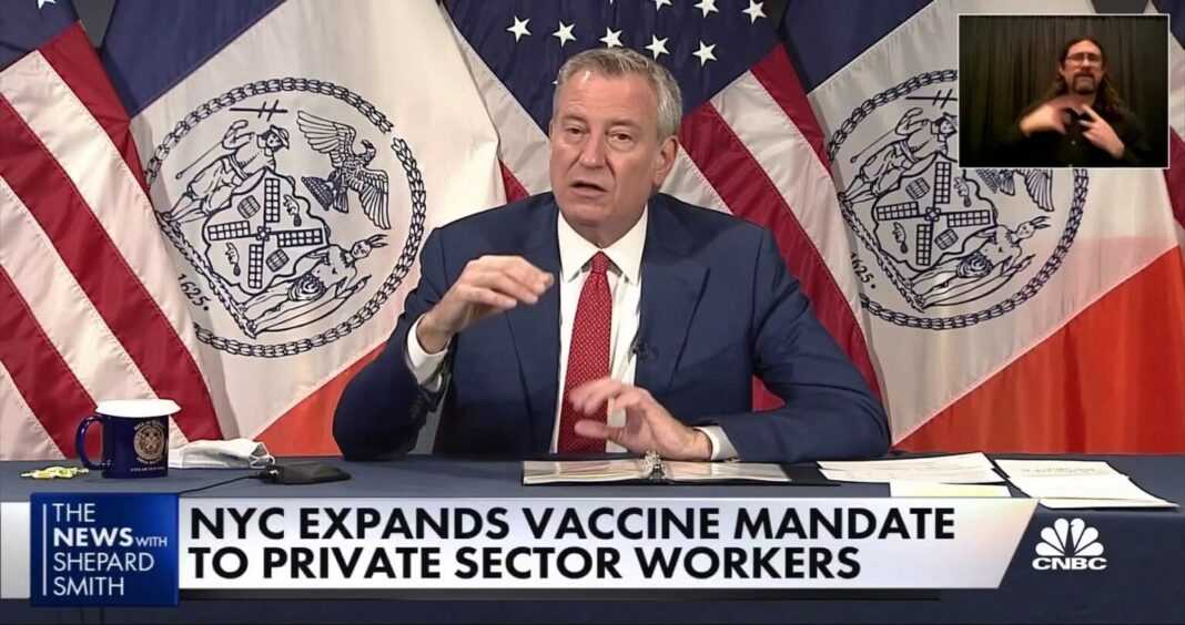 Η Πόλη της Νέας Υόρκης: Ο Δήμαρχος της Νέας Υόρκης Μπιλ ντε Μπλάζιο είπε ότι η εντολή έχει προγραμματιστεί να τεθεί σε ισχύ στις 27 Δεκεμβρίου. «Εμείς στη Νέα Υόρκη αποφασίσαμε να χρησιμοποιήσουμε μια προληπτική απεργία για να κάνουμε πραγματικά κάτι τολμηρό για να σταματήσουμε την περαιτέρω ανάπτυξη της covid και τους κινδύνους που προκαλεί σε όλους μας», είπε ο Bill de Blasio, σύμφωνα με το Associated Press. –Οι εργοδότες του κλάδου στη Νέα Υόρκη θα καλύπτονται από αυτήν την εντολή εμβολίου από τις 27 Δεκεμβρίου.”
