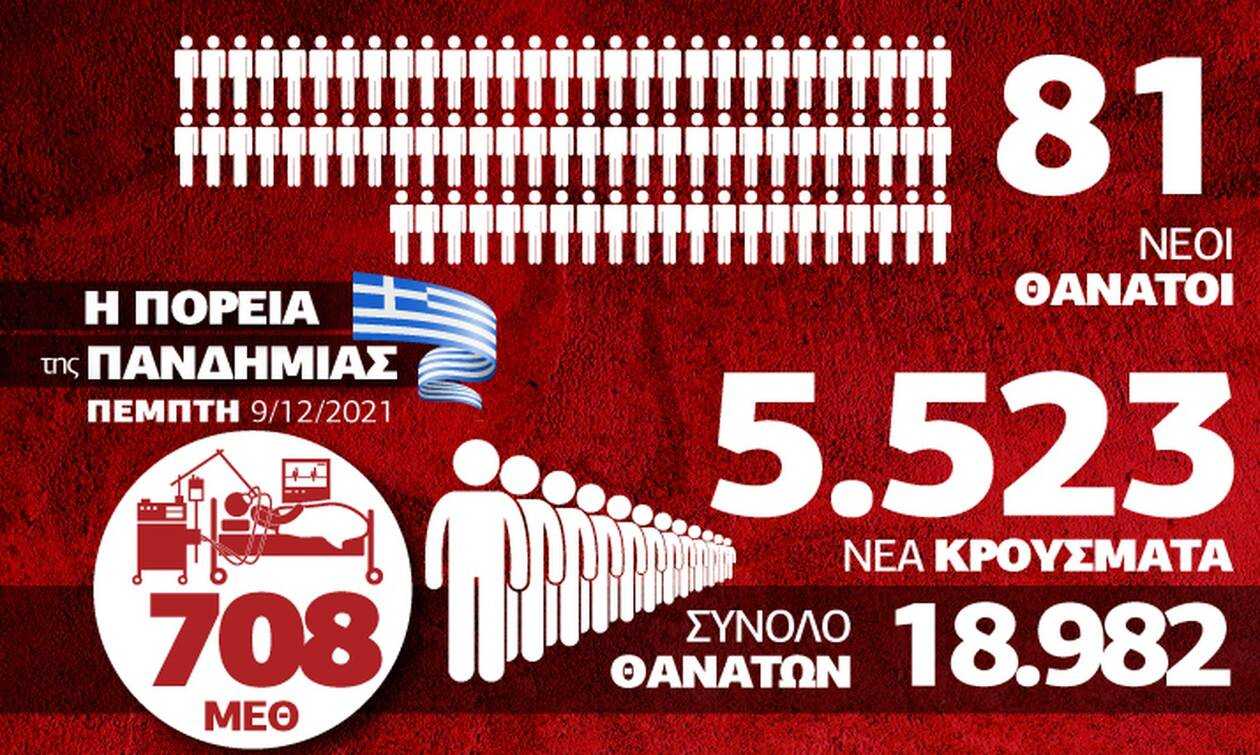 Σήμερα, ο ΕΟΔΥ ανακοίνωσε 5.523 κρούσματα, 81 θάνατοι και 708 στις ΜΕΘ.