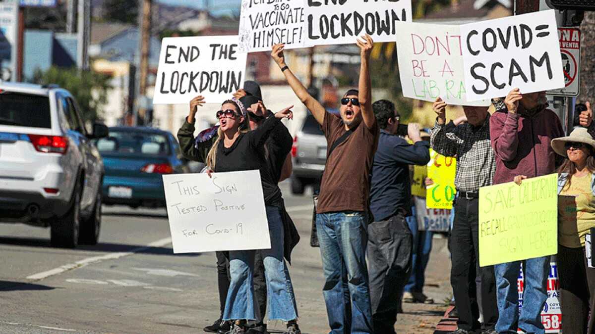 Διαδηλωτές κατά του εμβολιασμού διαδηλώνουν έξω από τις πόρτες του γκαράζ της Ενιαίας Σχολικής Περιφέρειας του Λος Άντζελες, τα κεντρικά γραφεία της LAUSD στο Λος Άντζελες.