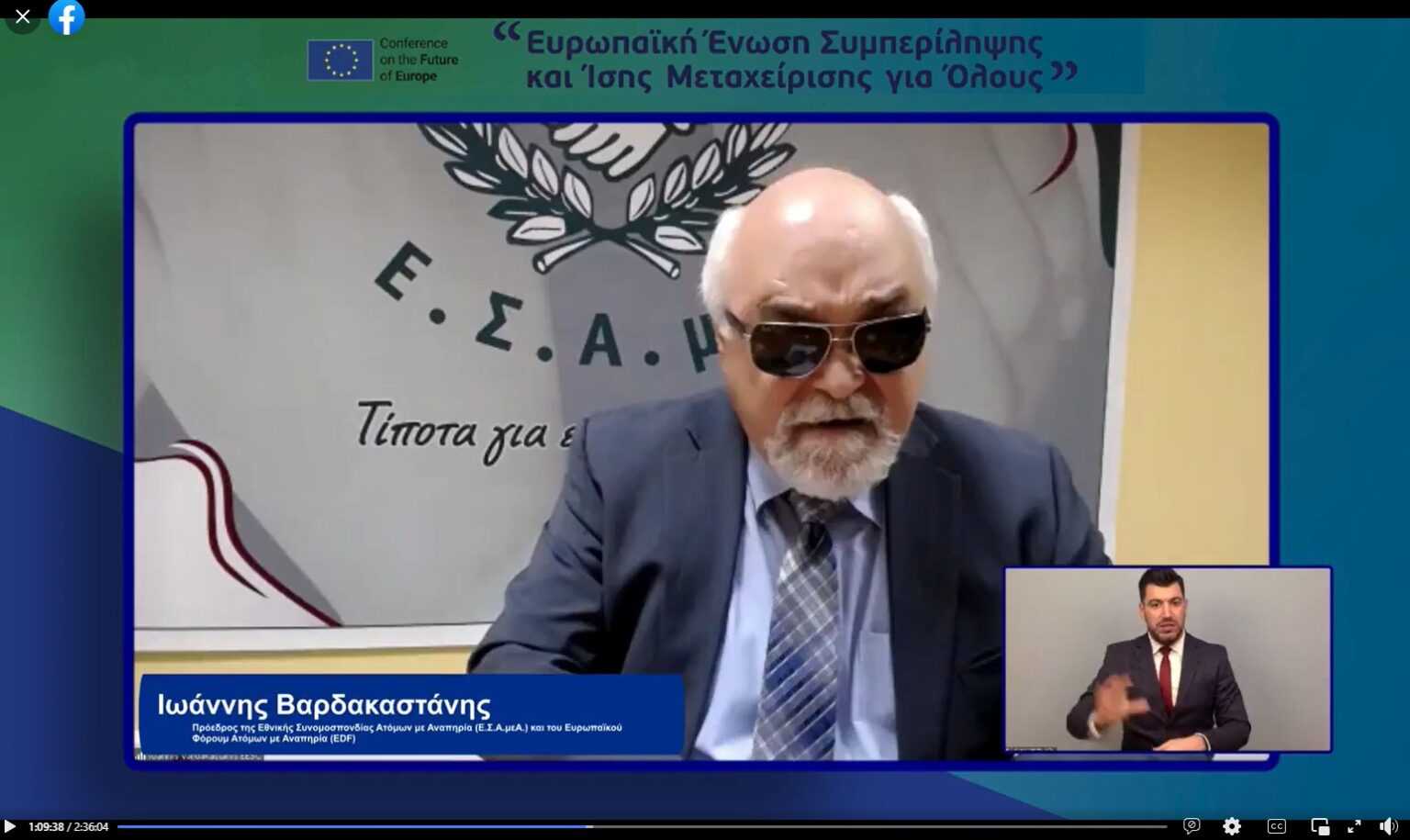 Στην εκδήλωση με τίτλο «Ευρωπαϊκή Ενωση Συμπερίληψης και ‘Ίσης Μεταχείρισης για ‘Όλους: Εφαρμόζοντας τη Σύμβαση των Ηνωμένων Εθνών για τα Δικαιώματα των Ατόμων με Αναπηρίες», που πραγματοποιήθηκε στο πλαίσιο της Διάσκεψης για το Μέλλον της Ευρώπης υπό τον αναπληρωτή υπουργό Εξωτερικών Μιλτιάδη Βαρβιτσιώτη, σε συνεργασία με την Εθνική Συνομοσπονδία Ατόμων με Αναπηρία (Ε.Σ.Α.μεΑ.) και με την επιστημονική υποστήριξη του Ινστιτούτου της ΕΣΑμεΑ ΙΝ-ΕΣΑμεΑ, μίλησε ο πρόεδρος της ΕΣΑμεΑ Ιωάννης Βαρδακαστάνης, την Τρίτη 21 Δεκεμβρίου.