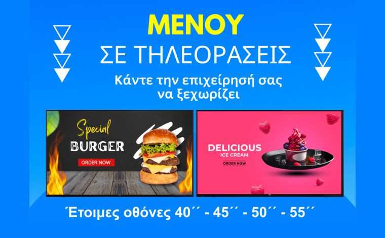 Μενού σε τηλεοράσεις: Δεκάδες επιχειρήσεις με μεγάλη ροή επισκεπτών από το ταμείο (take away), ιατρεία και λιανικού εμπορίου, επιλέγουν να παρουσιάζουν τα προϊόντα και το μενού τους μέσα από οθόνες τηλεόρασης