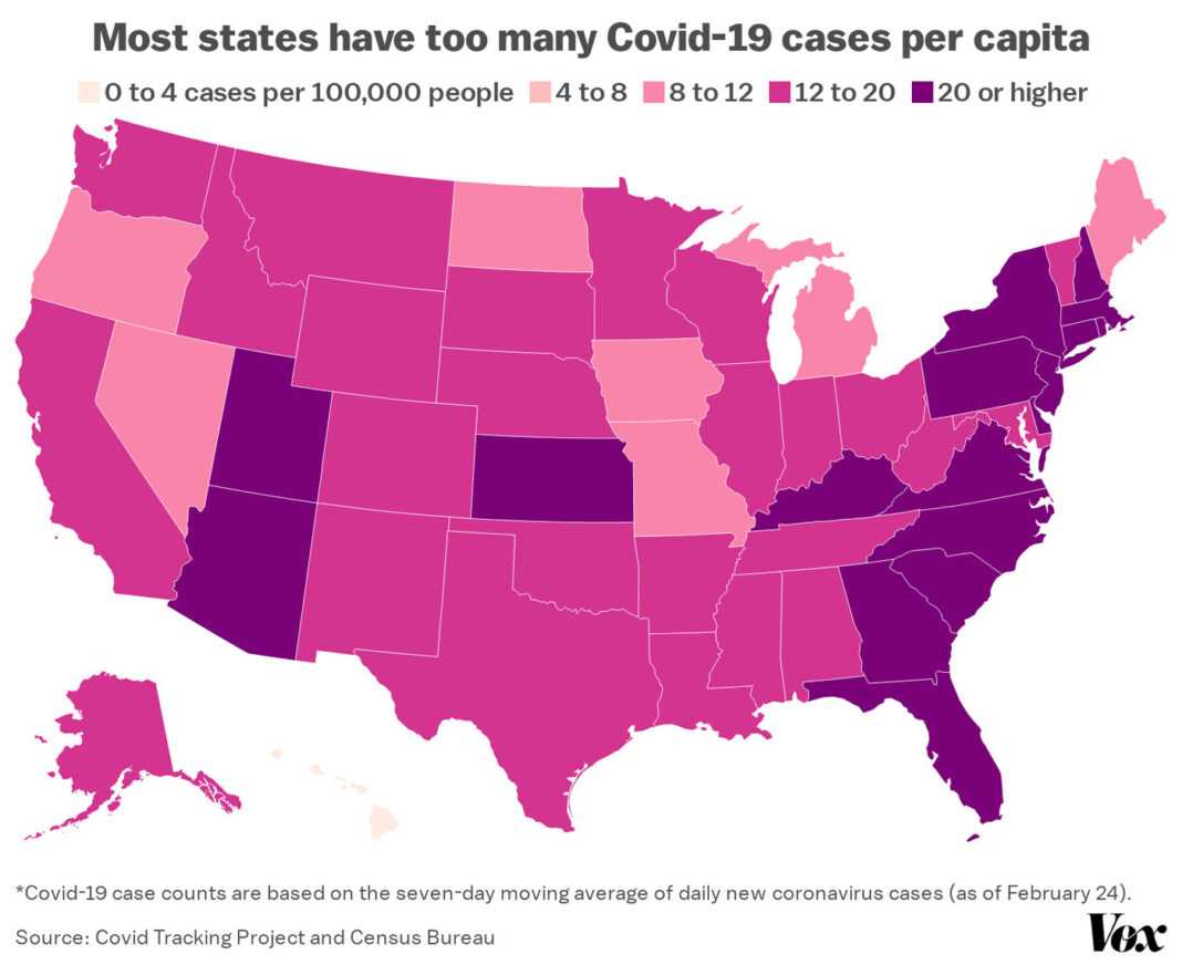 1. Ουάσιγκτον, D.C. – Κρούσματα τις τελευταίες 7 ημέρες/ 100.000: 2.038,1 2. Νιου Τζέρσεϊ – Κρούσματα τις τελευταίες 7 ημέρες/ 100.000: 1.375,1 3. Φλόριντα – Κρούσματα τις τελευταίες 7 ημέρες/ 100 χιλιάδες: 1.186,4 4. Rhode Island – Κρούσματα τις τελευταίες 7 ημέρες/ 100K: 1.062,9 5. Μέριλαντ – Κρούσματα τις τελευταίες 7 ημέρες/ 100 χιλιάδες: 1.028,9 6. Νέα Υόρκη – Κρούσματα τις τελευταίες 7 ημέρες/ 100.000: 1.027,7 7. Ιλινόις – Κρούσματα τις τελευταίες 7 ημέρες/ 100 χιλιάδες: 921,8 8. Μασαχουσέτη – Περιπτώσεις τις τελευταίες 7 ημέρες/ 100K: 886,4 9. Κονέκτικατ – Υποθέσεις τις τελευταίες 7 ημέρες/ 100.000: 879,1 10. Οχάιο – Κρούσματα τις τελευταίες 7 ημέρες/ 100 χιλιάδες: 813,9 11. Delaware – Περιπτώσεις τις τελευταίες 7 ημέρες/ 100K: 761,6 12. Χαβάη – Κρούσματα τις τελευταίες 7 ημέρες/ 100K: 760,5 13. Γεωργία – Κρούσματα τις τελευταίες 7 ημέρες/ 100K: 734 14. Virginia – Περιστατικά τις τελευταίες 7 ημέρες/ 100K: 706,8 15. Μίσιγκαν – Κρούσματα τις τελευταίες 7 ημέρες/ 100 χιλιάδες: 647,8 16. Πενσυλβάνια – Κρούσματα τις τελευταίες 7 ημέρες/ 100.000: 623 17. Λουιζιάνα – Κρούσματα τις τελευταίες 7 ημέρες/ 100 χιλιάδες: 617,2 18. Νιου Χάμσαϊρ – Κρούσματα τις τελευταίες 7 ημέρες/ 100 χιλιάδες: 589,2 19. Κολοράντο – Κρούσματα τις τελευταίες 7 ημέρες/ 100 χιλιάδες: 566,5 20. Τενεσί – Κρούσματα τις τελευταίες 7 ημέρες/ 100 χιλιάδες: 546,7 21. Ουισκόνσιν – Περιστατικά τις τελευταίες 7 ημέρες/ 100 χιλιάδες: 540,7 22. Αλαμπάμα – Κρούσματα τις τελευταίες 7 ημέρες/ 100 χιλιάδες: 515,2 23. Ιντιάνα – Κρούσματα τις τελευταίες 7 ημέρες/ 100 χιλιάδες: 504,9 24. Κάνσας – Κρούσματα τις τελευταίες 7 ημέρες/ 100 χιλιάδες: 481,3 25. Νότια Καρολίνα – Κρούσματα τις τελευταίες 7 ημέρες/ 100 χιλιάδες: 466,4 26. Missouri – Περιπτώσεις τις τελευταίες 7 ημέρες/ 100K: 462 27. Μισισιπής – Κρούσματα τις τελευταίες 7 ημέρες/ 100K: 448,6 28. Δυτική Βιρτζίνια – Κρούσματα τις τελευταίες 7 ημέρες/ 100 χιλιάδες: 444,9 29. Κεντάκι – Κρούσματα τις τελευταίες 7 ημέρες/ 100.000: 441 30. Ουάσιγκτον – Υποθέσεις τις τελευταίες 7 ημέρες/ 100K: 428,1 31. Μινεσότα – Κρούσματα τις τελευταίες 7 ημέρες/ 100 χιλιάδες: 400,5 32. Αρκάνσας – Υποθέσεις τις τελευταίες 7 ημέρες/ 100K: 385 33. Maine – Υποθέσεις τις τελευταίες 7 ημέρες/ 100K: 379 34. Καλιφόρνια – Περιστατικά τις τελευταίες 7 ημέρες/ 100K: 375,1 35. Νεμπράσκα – Περιπτώσεις τις τελευταίες 7 ημέρες/ 100K: 371 36. Βόρεια Καρολίνα – Κρούσματα τις τελευταίες 7 ημέρες/ 100 χιλιάδες: 366,3 37. Αϊόβα – Περιπτώσεις τις τελευταίες 7 ημέρες/ 100K: 366 38. Νότια Ντακότα – Κρούσματα τις τελευταίες 7 ημέρες/ 100 χιλιάδες: 355,6 39. Τέξας – Περιστατικά τις τελευταίες 7 ημέρες/ 100K: 346,8 40. Γιούτα – Κρούσματα τις τελευταίες 7 ημέρες/ 100 χιλιάδες: 343,6 41. Βόρεια Ντακότα – Κρούσματα τις τελευταίες 7 ημέρες/ 100K: 340,5 42. Βερμόντ – Κρούσματα τις τελευταίες 7 ημέρες/ 100 χιλιάδες: 336,7 43. Νεβάδα – Κρούσματα τις τελευταίες 7 ημέρες/ 100 χιλιάδες: 328,8 44. Αριζόνα – Κρούσματα τις τελευταίες 7 ημέρες/ 100K: 328,3 45. Νέο Μεξικό – Κρούσματα τις τελευταίες 7 ημέρες/ 100.000: 301,5 46. Οκλαχόμα – Κρούσματα τις τελευταίες 7 ημέρες/ 100 χιλιάδες: 297,3 47. Αλάσκα – Κρούσματα τις τελευταίες 7 ημέρες/ 100 χιλιάδες: 241,7 48. Όρεγκον – Υποθέσεις τις τελευταίες 7 ημέρες/ 100K: 215,8 49. Ουαϊόμινγκ – Κρούσματα τις τελευταίες 7 ημέρες/ 100 χιλιάδες: 203,9 50. Αϊντάχο – Περιπτώσεις τις τελευταίες 7 ημέρες/ 100 χιλιάδες: 178,4 51. Μοντάνα – Περιπτώσεις τις τελευταίες 7 ημέρες/ 100 χιλιάδες: 153