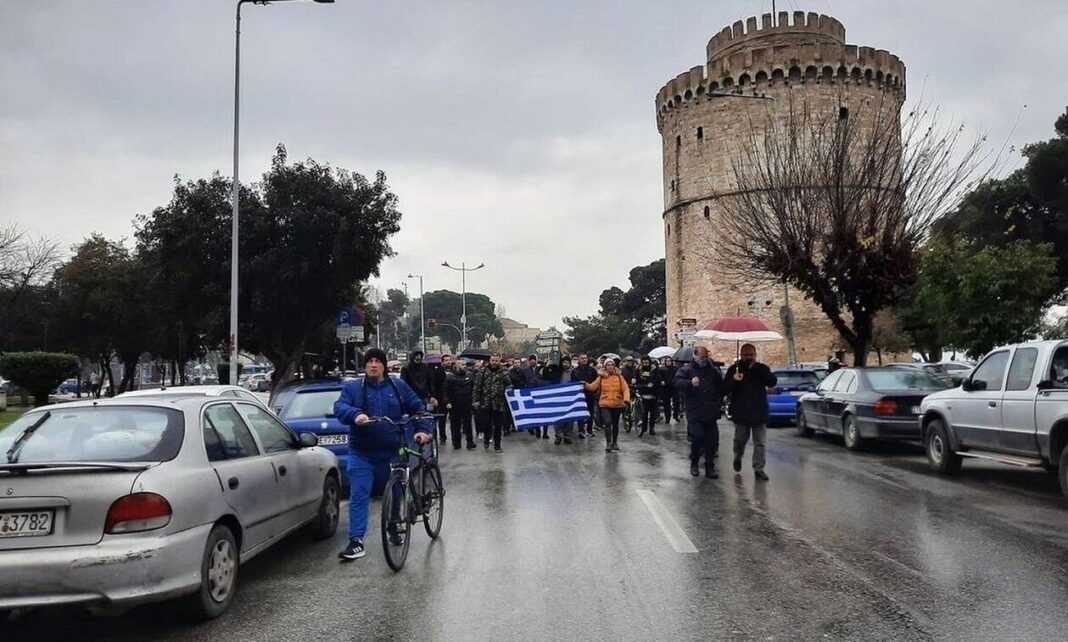 Πορεία διαμαρτυρίας πραγματοποίησαν το μεσημέρι της Κυριακής αρνητές του υποχρεωτικού εμβολιασμού στο κέντρο της Θεσσαλονίκης.