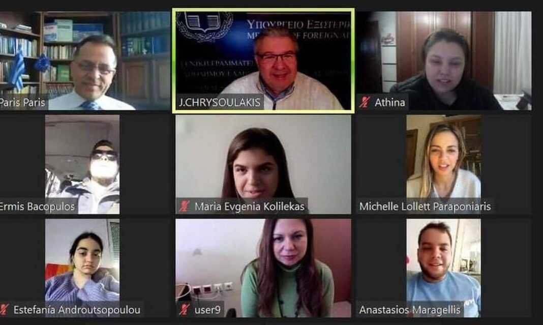 Σε εγκάρδιο κλίμα πραγματοποιήθηκε διαδικτυακή συνάντηση του Γενικού Γραμματέα Απόδημου Ελληνισμού και Δημόσιας Διπλωματίας του Υπουργείου Εξωτερικών, Ιωάννη Χρυσουλάκη με νέους ομογενείς από τη Βενεζουέλα, στο πλαίσιο ανάπτυξης δικτύων επικοινωνίας και συνεργασίας με τη νέα γενιά ομογενών από όλον τον κόσμο.