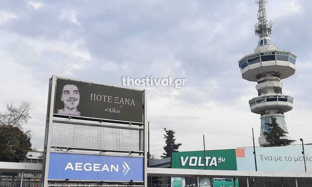 Με φωτογραφία και τη φράση «Ποτέ Ξανά» τιμάται στη νότια πύλη της ΔΕΘ η μνήμη του αδικοχαμένου Άλκη Καμπανού, μαγνητίζοντας τα βλέμματα των περαστικών και προκαλώντας συγκίνηση και θλίψη για τον 19χρονο που δολοφονήθηκε άγρια από ενέδρα οπαδών.