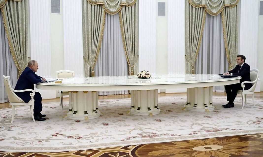 Παρατηρητές έμειναν έκπληκτοι από τις φωτογραφίες που δημοσιεύτηκαν, όπου Μακρόν και Πούτιν κάθονταν στις αντίθετες πλευρές ενός μήκους 4 μέτρων τραπεζιού, προκειμένου να συζητήσουν την ουκρανική κρίση τη Δευτέρα, με ορισμένους διπλωμάτες και άλλους να υποστηρίζουν ότι ο Πούτιν ενδεχομένως ήθελε να στείλει ένα διπλωματικό μήνυμα.