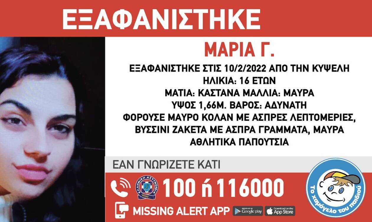 Στις 10.02.2022, στις 19.00μμ, εξαφανίστηκε από την περιοχή της Κυψέλης, η Μαρία Γ., 16 ετών, ελληνικής καταγωγής