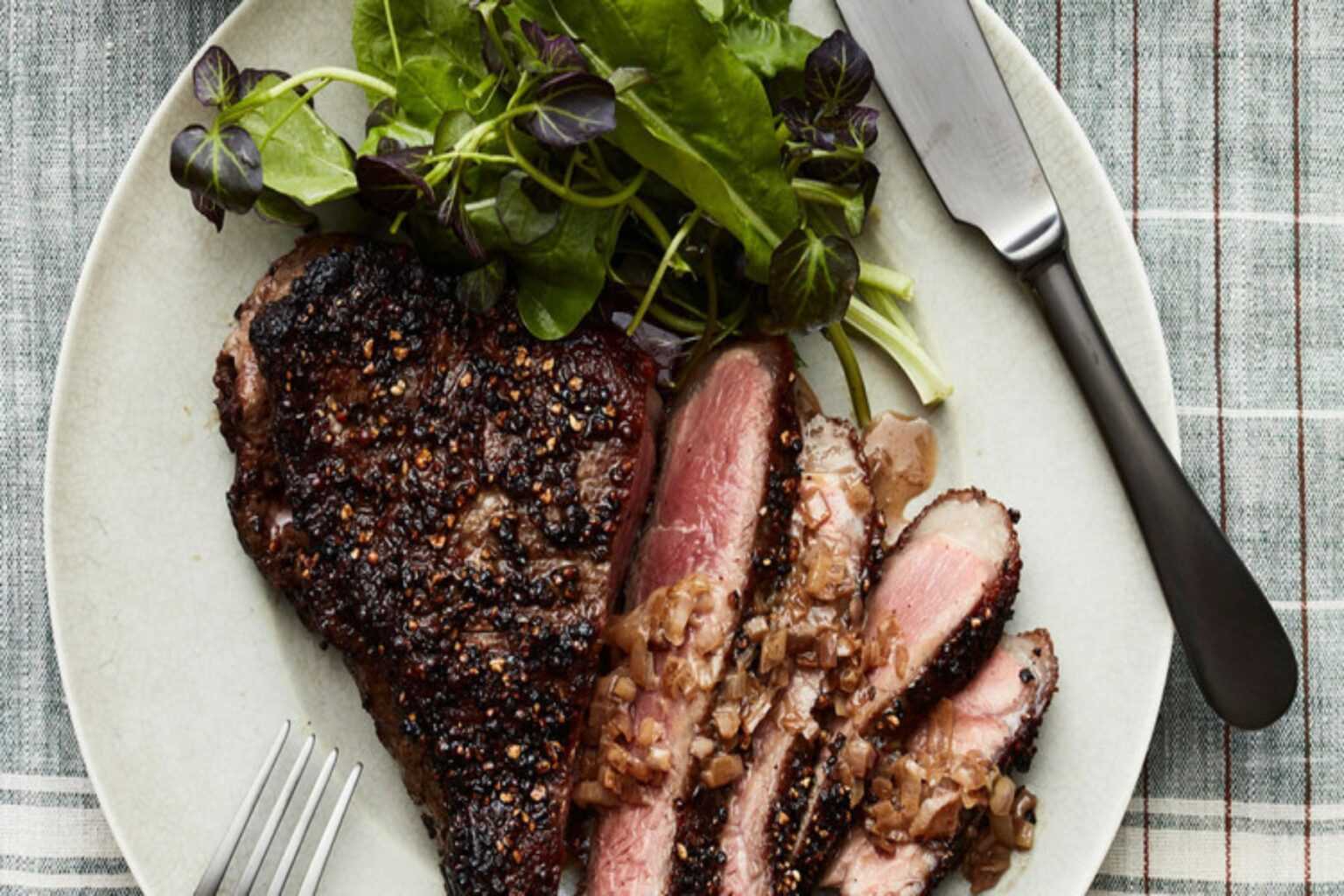 Προθερμαίνετε το φούρνο στους 200 βαθμούς. Ζεσταίνουμε το λάδι σε μεγάλο τηγάνι σε μέτρια προς δυνατή φωτιά. Καρυκεύστε τη μπριζόλα με τους τριμμένους κόκκους πιπεριού και 1/2 κουταλάκι του γλυκού αλάτι. Μαγειρέψτε μέχρι να ροδίσει καλά από κάθε πλευρά, περίπου 4 λεπτά. Μεταφέρετέ το σε φύλλο ψησίματος με στεφάνη και ψήνετε μέχρι το θερμόμετρο να δείξει μία μέση θερμοκρασία. Μεταφέρετε σε ξύλο κοπής και αφήστε το να ξεκουραστεί τουλάχιστον 5 λεπτά πριν το κόψετε.