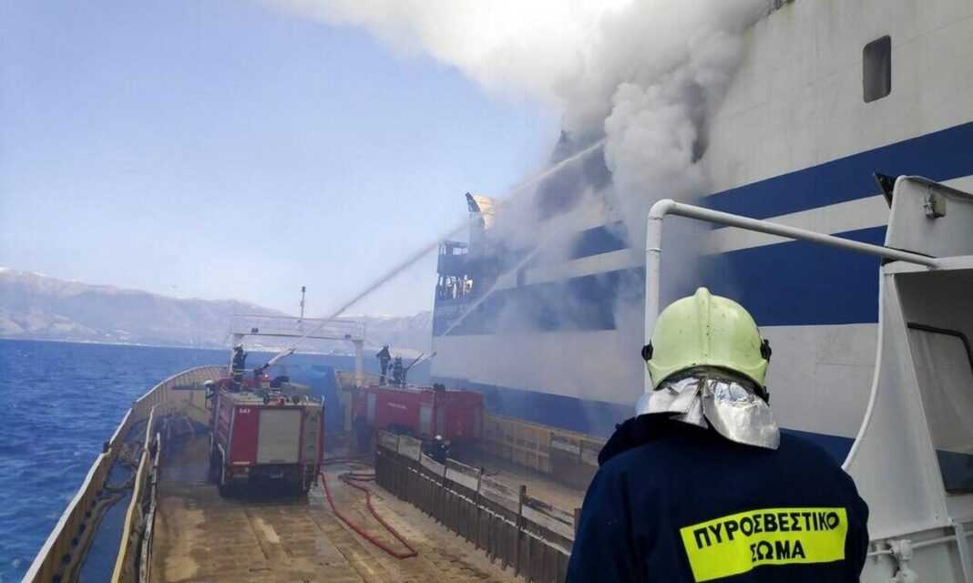 Συνεχίζεται το έργο της πυρόσβεσης στο επιβατηγό-οχηματαγωγό πλοίο Euroferry Olympia στο οποίο την Παρασκευή (18/2) εκδηλώθηκε πυρκαγιά, πιθανόν στο τρίτο κατάστρωμα, ενώ έπλεε κοντά στην Ερεικούσα κατά την εκτέλεση του προγραμματισμένου δρομολογίου του από την Ηγουμενίτσα προς το Μπρίντεζι.